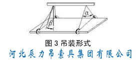 3.2  單板鉗與雙板鉗起吊鋼板時(shí),必須與橫梁配套使用,其中α在(45-90)°之間,β在(0-15)°之間。橫梁的有效長度應(yīng)不小于鋼板長的1/3。單板鉗或雙板鉗兩只試驗(yàn)為額定載荷,四只為一組吊裝作業(yè),吊運(yùn)過程中,鋼板應(yīng)保持水平見圖3。